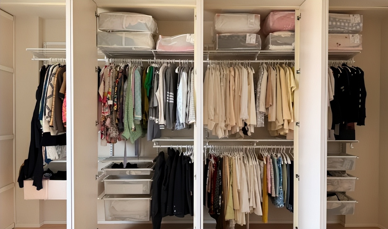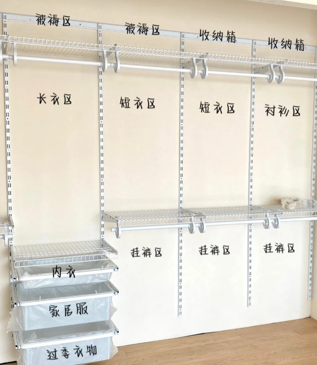 比如,它里面的挂钩和收纳板都能随意搭配去收纳,上面放被子,中间悬挂衣服,下方则放内衣裤、袜子等等,十分好用。