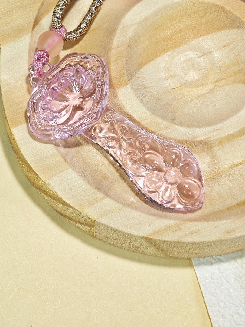 吊坠整体呈现出一种柔和而温润的质感,像是被岁月温柔抚摸过的珍宝。芙蓉花瓣的造型栩栩如生,每一片花瓣都有着细腻的纹理,微微卷曲的边缘仿佛在诉说着它的灵动与婉约。如意的造型,线条流畅自然,从头部的圆润如意云纹,到柄身的修长优雅,无一不展现着传统工艺的精湛。 而琉璃特有的晶莹剔透,又为它增添了几分空灵与神秘,让人忍不住想要一探究竟,触摸它,感受它的独特魅力。