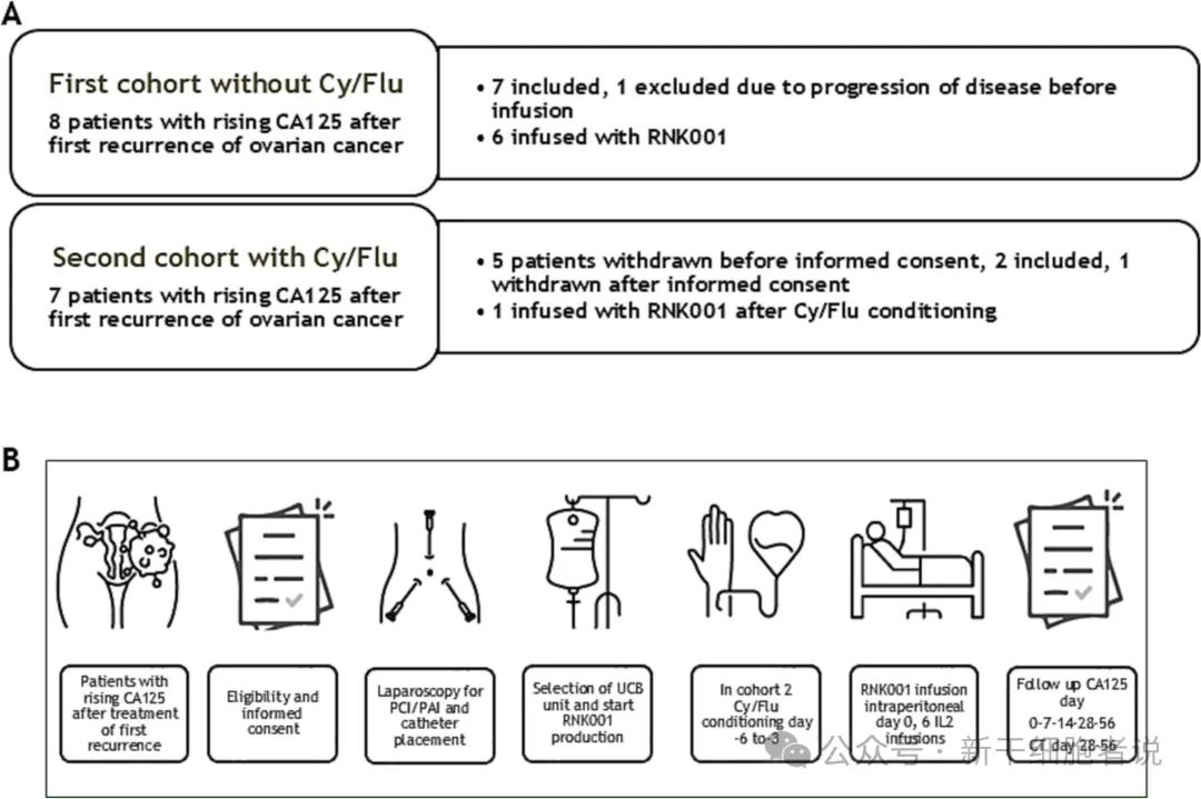 2026年1月,来自荷兰拉德堡德大学医学中心(Radboud University Medical Center)的研究人员及其合作者在《Gynecologic Oncology》杂志上发表了题为《Intraperitoneal infusion of stem cell-derived natural killer cells in recurrent epithelial ovarian cancer patients: Results of the phase 1 INTRO-01 trial》的文章,这项1期试验(NCT03539406)评估了源自脐带血造血干细胞和祖细胞(HSPC)、经体外制备的NK细胞制剂RNK001的安全性。