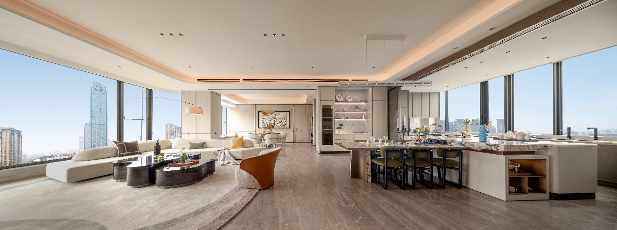 1、来到样板间后,其极致尺度必然震撼每一个人——鲲鹏520㎡不仅是一层一户,还搭配两部电梯、双入户门,打造了两条专属动线,分别直通社交动区与家庭静区,归家、社交、休憩互不干扰,把鼎豪居住的私密性做到了极致;