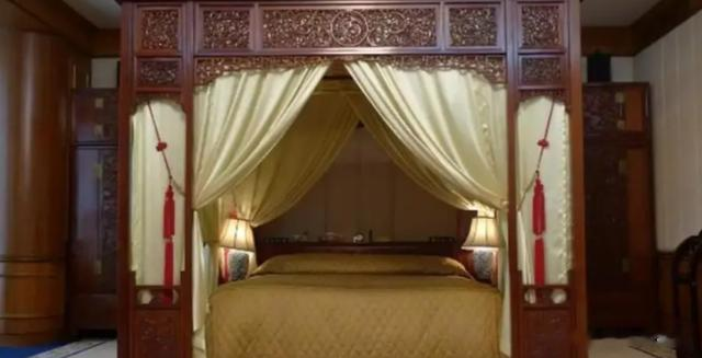 上到二楼,有一间中式的豪华套房,和一间西式风格的套房。下入住18号楼的外宾们,都喜欢住中式的那间套房,古色古香,就连卧室的床也是“龙床”,因为整张床都雕刻有形象各异的龙。如下图所示: