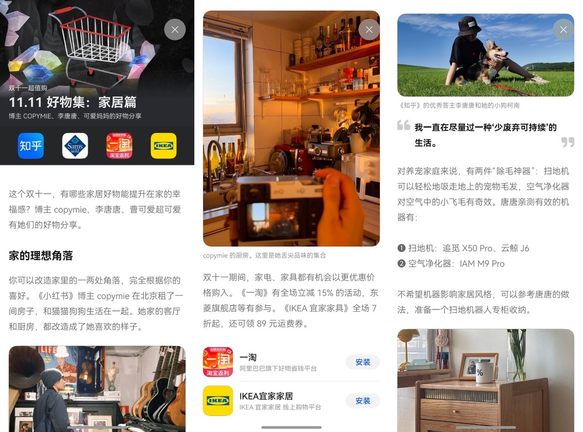 比如,《11.11好物集:家居篇》专题,就整合了知乎、宜家、一淘等App,结合真实场景分享提升生活幸福感的好物。小红书博主推荐的宜家黑色沙发,皮质耐抓,适合我这样养了喵星人的用户。专题还同步更新了各平台的优惠信息,帮我边种草边省钱。我还可以直接用底部的“分享”功能把整个专题转给正在装修的朋友,比单发链接更高效。