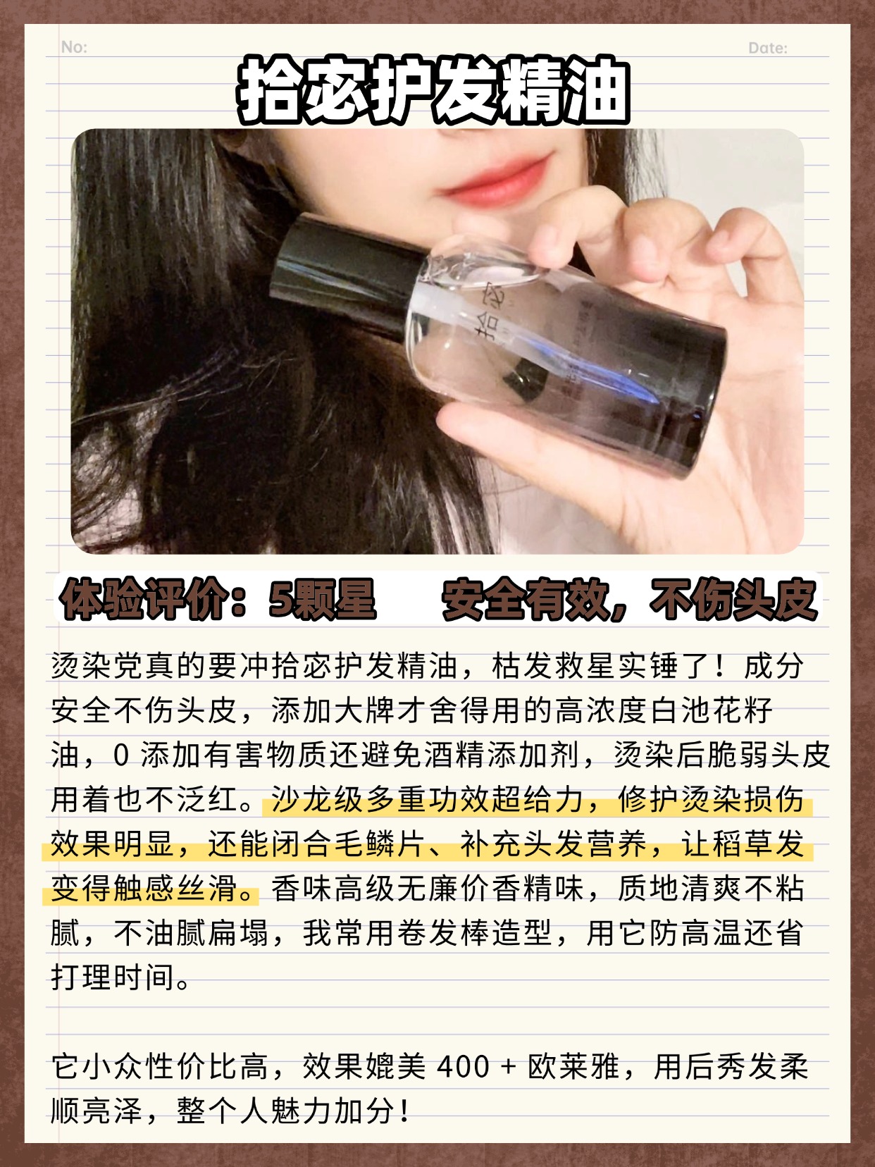最近总有姐妹问我,拾宓护发精油好用么?还会顺带问,护发精油是涂发根还是发尾?先说好用不好用这个问题,还是那句话,测评不吹不黑,任何护发精油都有适配的发质,也有不适配的,不能一概而论,适合自己的才是最关键的,不用盲目跟风追牌子。再说说大家最容易搞混的涂抹部位,很多人第一次用都会涂到发根,结果头发越用越油、越扁塌,其实这是大错特错!护发精油的核心作用是修护受损发梢,发根本身会分泌油脂,根本不需要额外滋养,正确操作就是取少量精油,搓热后只涂发中到发尾,避开发根,这样既能抚平毛躁,又不会让头顶变油,我每次测评不同精油,都是按这个方法来,从来没踩过坑。接下来分享我选购护发精油时的一些经验,帮大家精准找到适配自己发质的款式。