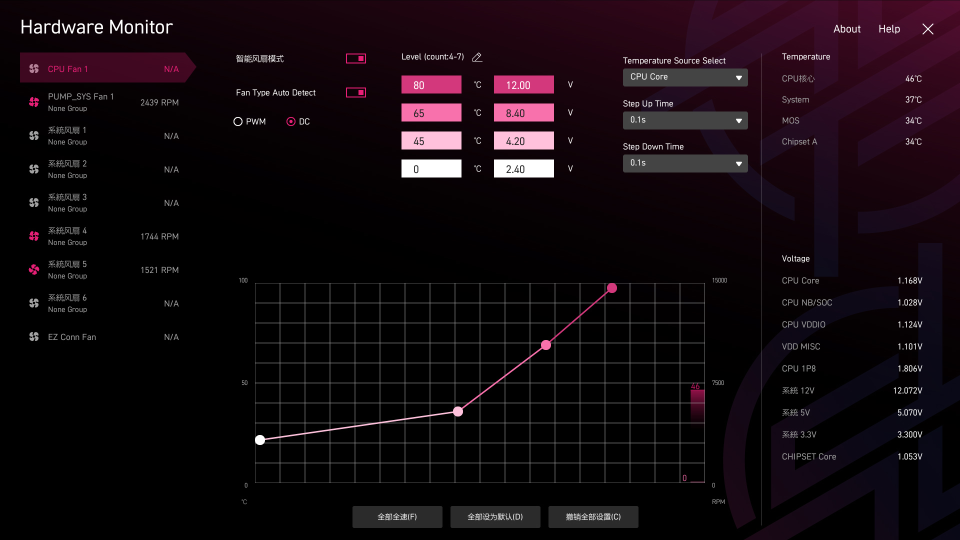 Hardware Monitor可实时监控硬件参数,查看CPU/内存电压、温度及风扇转速,并支持自定义风扇曲线。我们可以参考CPU核心温度、系统温度、MOS管温度、PCH芯片组温度以及CPU底座等信息设置风扇转速(以CPU核心温度为主)。