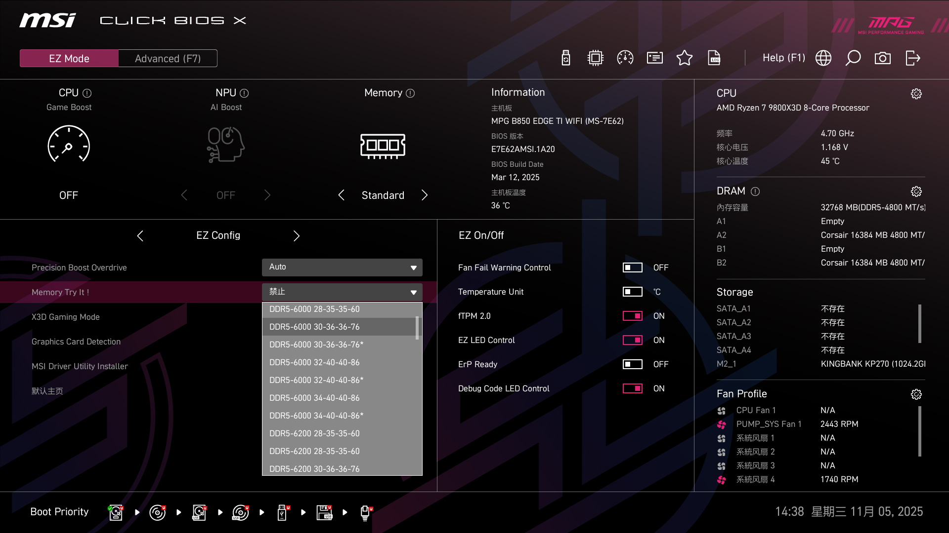 内存超频方面,除了AMD EXPO一键超频功能之外,微星BIOS还给用户设计了Memory Try It!功能,内置超多内存超频的优化方案,无需手动调整内存频率、电压和时序等小参数即可轻松提高DDR 5内存性能,简单、粗暴、实用,是入门用户的福音。