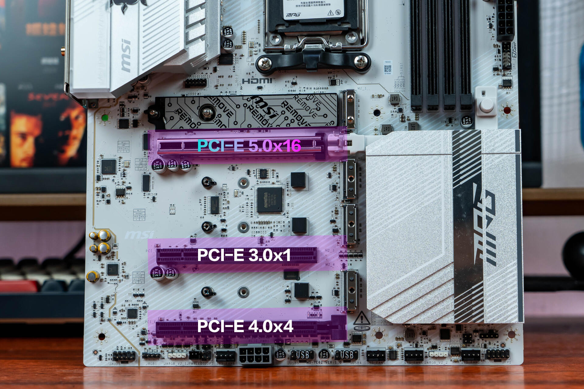 微星MPG B850 EDGE TI WIFI共配备了3个全尺寸PCIe插槽,第一槽为PCI-E 5.0 x16满速通道(直连CPU),为了应对高端显卡做了金属加固处理,支持快拆设计;第二槽为PCI-E 3.0 x1通道(芯片组),第三个插槽为PCI-E4.0x4通道(芯片组)。