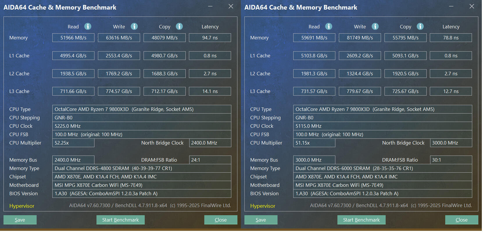 实测,本机内存默认频率4800MHz,时序40-39-39-77,内存读写速度分别是51966 MB/s和63616 MB/s,拷贝速度48079 MB/s,延迟94.7 ns。开启EXPO后,频率提升至6000 MHz,时序28-35-35-76,性能测试相比默认频率有大幅提升: