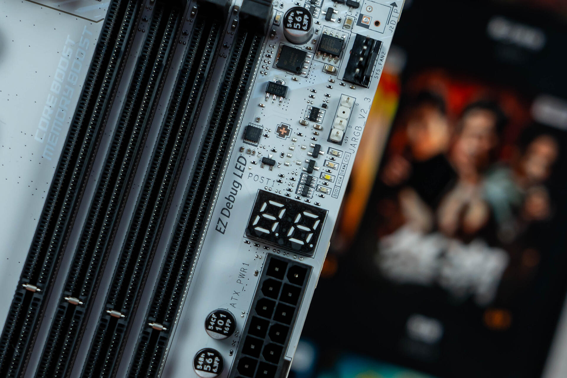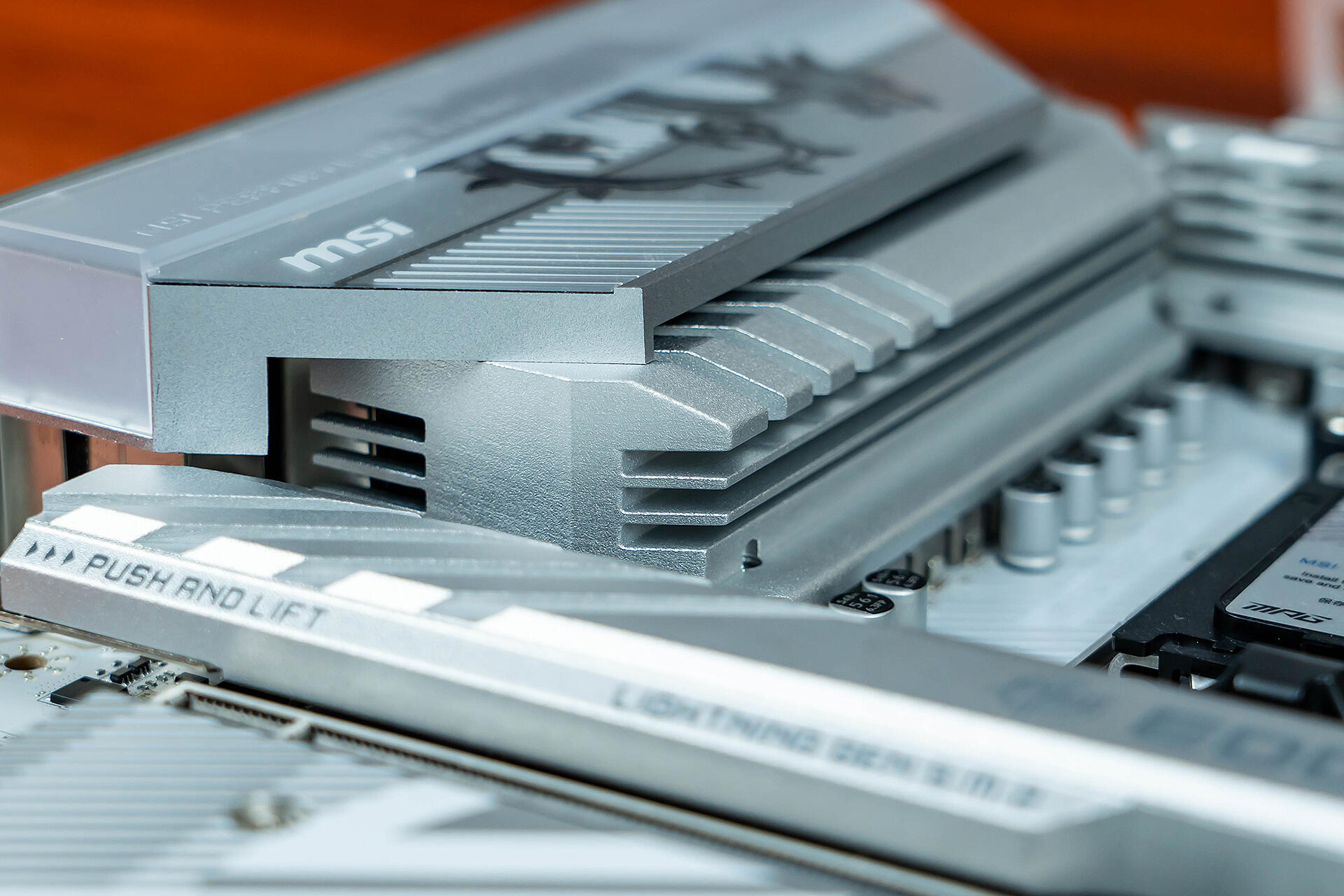 考虑到M.2 SSD尤其是PCIe 5.0 SSD的巨大发热量,主板为4个M.2插槽都配备了厚实的金属散热片和散热垫片,避免因为SSD主控温度过高而出现降速问题。