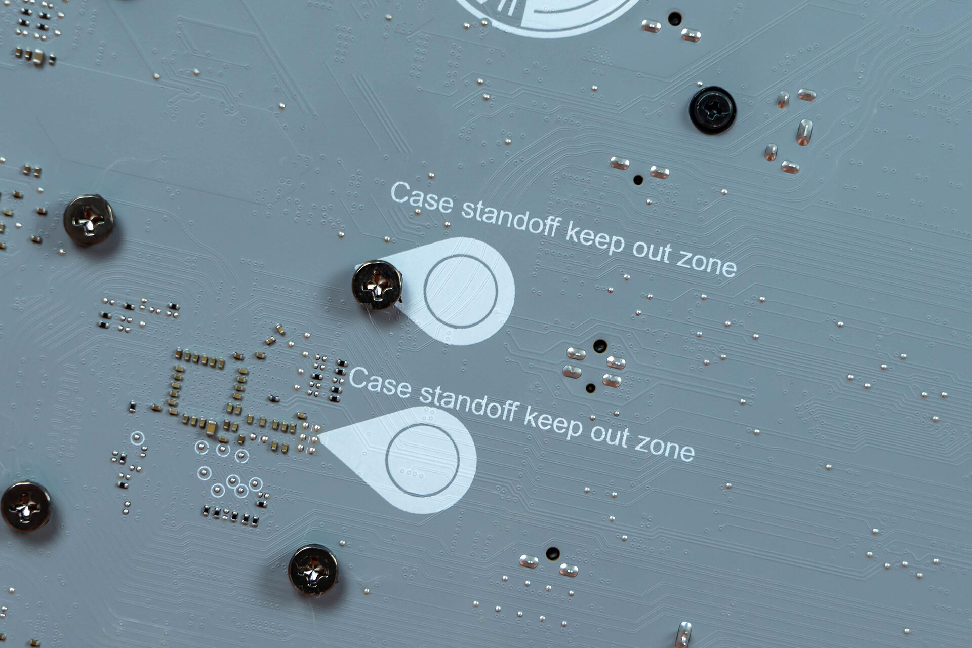 主板背面一览,焊点处理很工整,CPU位置有一块防护钢板,九个安装螺丝孔和三个重点走线区域进行了特别标注,印有“Case standoff keep out zone”,提醒用户在安装时要特别留意这几处位置,不能碰撞和挤压,避免损伤电路。