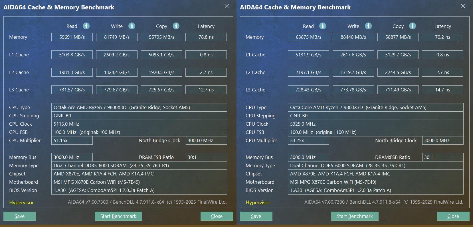 开启PBO Enhanced Mode 3,内存读取速度为59691 MB/s,写入速度为81749 MB/s,拷贝速度为55795 MB/s,延迟为78.8 ns;随后,再开启X3D Gameing Mode,内存读取速度为63875 MB/s,写入速度为88440 MB/s,拷贝速度为58877 MB/s,分别提升了约7%、8.2%、14.5%,延迟为70.2 ns,减少约11%。
