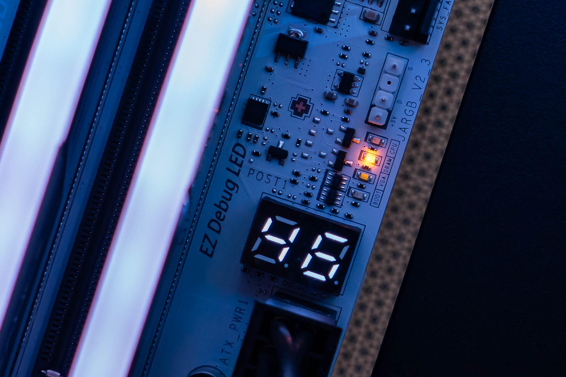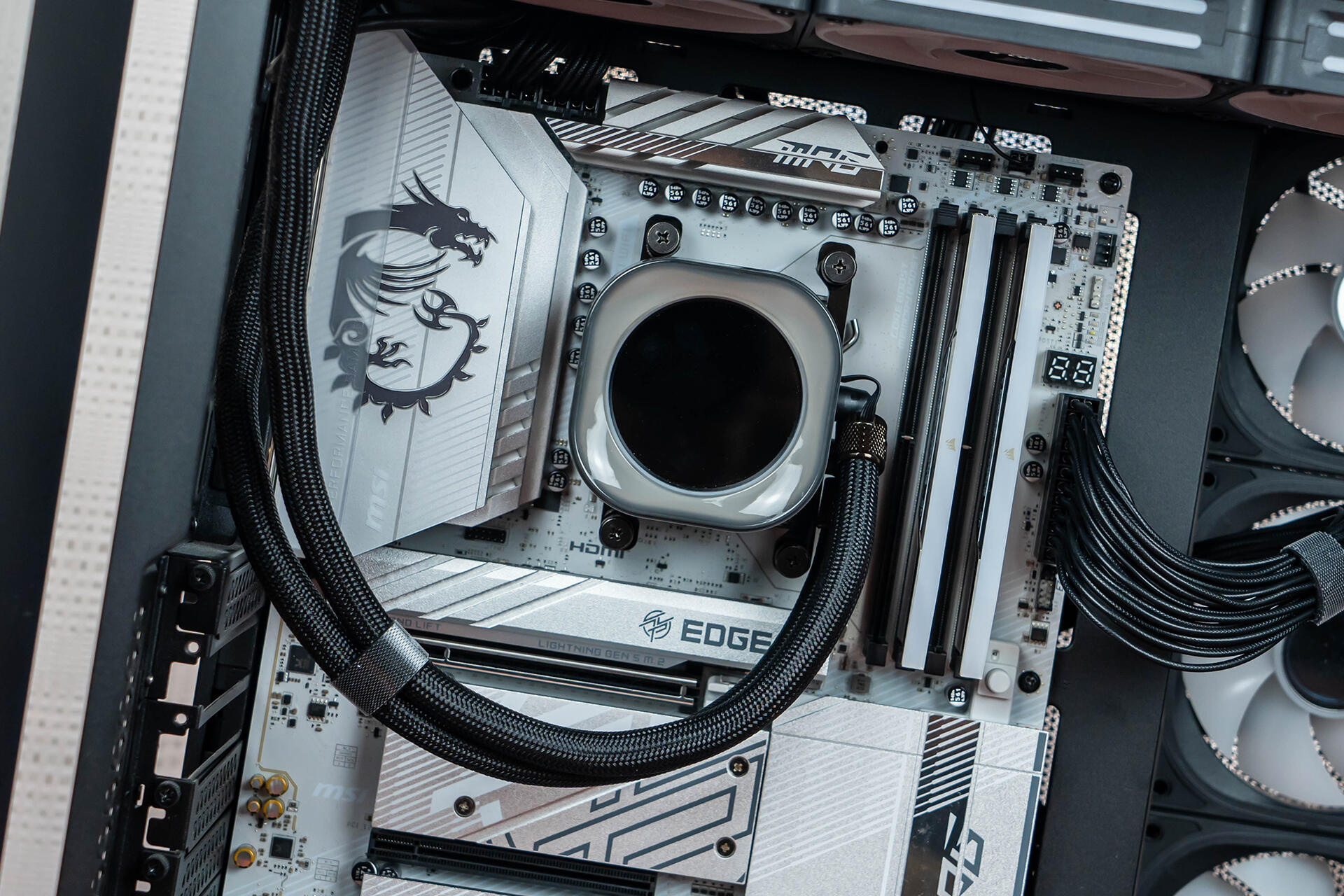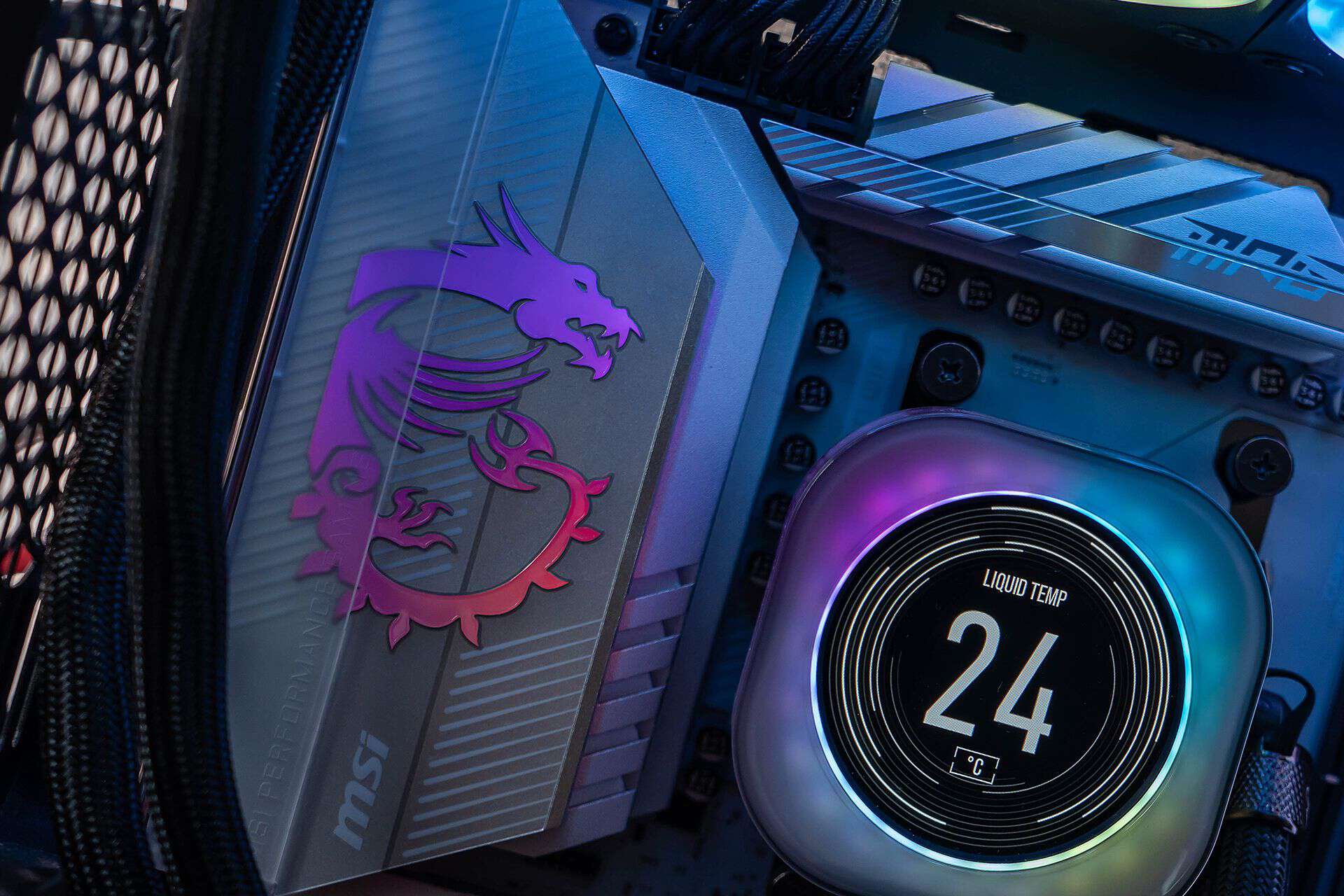 VRM散热片的“龙盾”图腾支持RGB灯效,表面覆盖了一条半透明磨砂盖板,丰富了视觉观感,为“冰冷”的外观注入一丝灵动气息。灯光效果可以在MSI Center软件内调控,灯光效果不会过度浮夸,更符合追求简洁、高级感的用户审美。