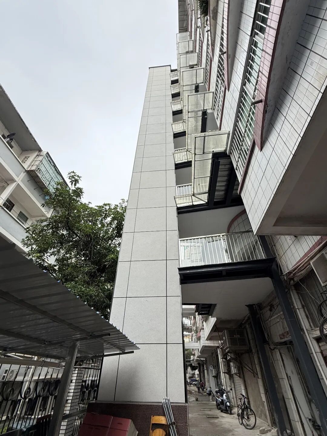 但人家早就考虑到了,新增的阳台和电梯井,用的全是独立承重结构,单独打地基,力量完全不放在原建筑上,就算电梯井出点问题,也绝不会影响到整栋楼。