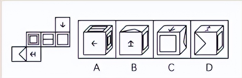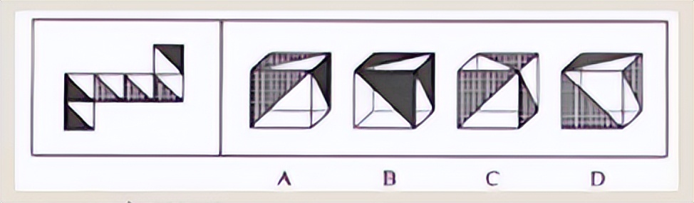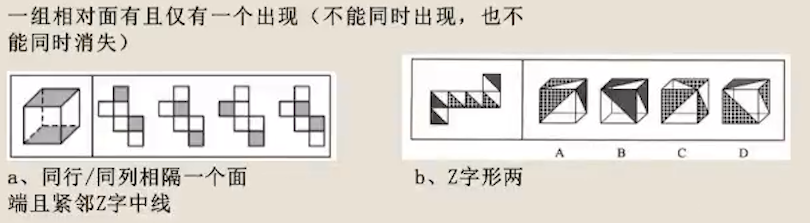 注释:首先C是不对的,三个面相邻不会同时出现在画面里。B选项中,两端的三角图案已经构成Z字形两端,所以他们两个 是像对面,不会出现在一个画面里;C选项中,图案的放置顺序是不一样的,是点对点的,所以D选项也不正确。故选A。