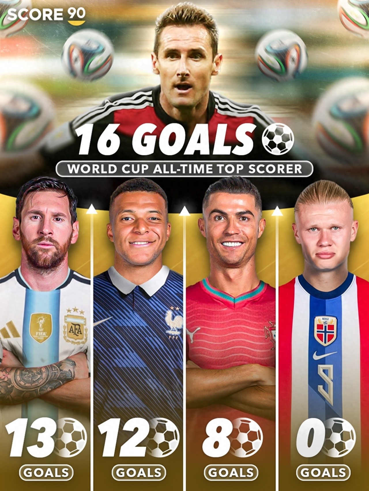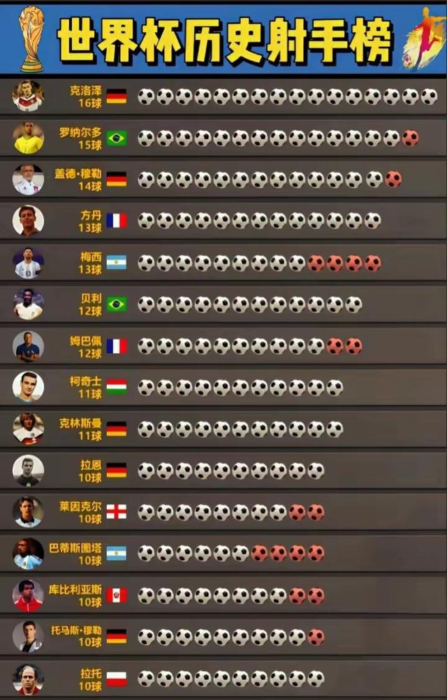 世界杯历史射手榜上,克洛泽(德国)在4届世界杯中打入了16个进球,已经超越了15球的罗纳尔多(巴西)排名第一,也就是世界杯历史射手。在目前现役球员中,梅西13球并列第四,姆巴佩12球并列第六,C罗8球无缘前十五。那么问题来了,谁能打破克洛泽16个世界杯进球的纪录呢?