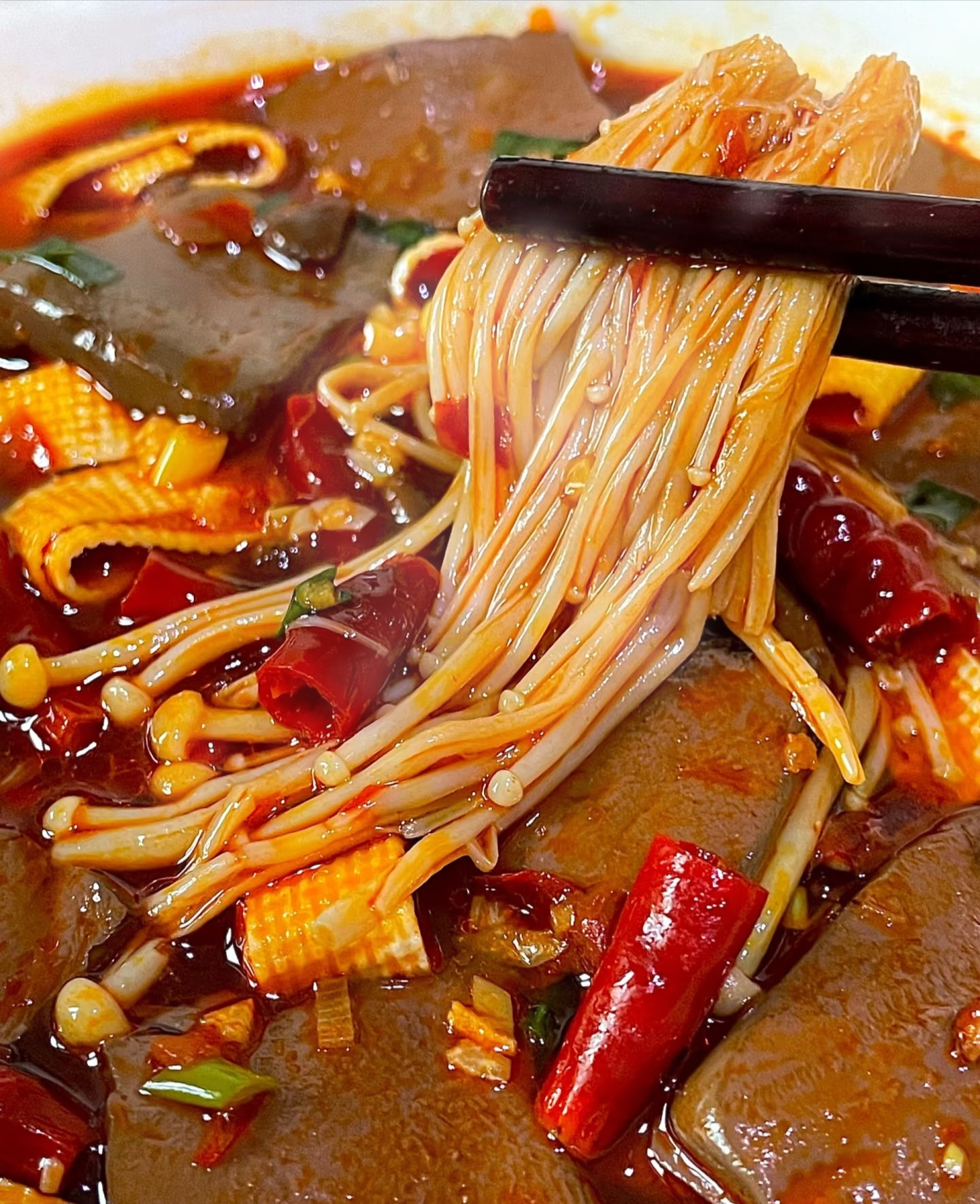 端锅上桌,先别急着夹,关火焖30秒,让鸭血“回魂”,表面的小孔吸饱汤汁;第一口必须“原汤化原食”,不配米饭,空口吃三块,辣到跳脚才过瘾;第二轮回加宽粉,像“吸辣面条”,爽滑到“呲溜呲溜”;第三轮把剩汤汁浇米饭,秒变“红油拌饭”,一粒米都不放过。最后,全家比赛“谁鼻尖先冒汗”,输的人洗碗——通常是我爸,因为他全程在喝冰啤酒降温。