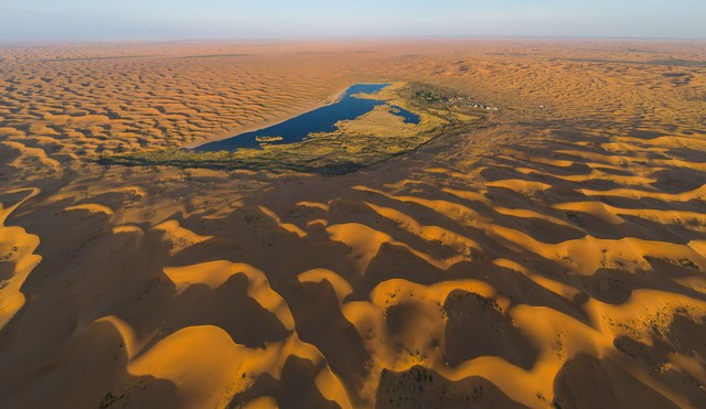 不远处,几位牧民正赶着羊群走向湖边,羊群踩过沙地的声音 “哒哒” 作响,与水鸟的鸣叫、风吹芦苇的 “沙沙” 声,汇成了一曲鲜活的生命乐章。我忽然想起《蒙古秘史》里的记载,成吉思汗的铁骑曾踏过这片沙漠,那时的库布其,或许也有零星的绿洲,却终究抵不过风沙的吞噬。而如今,这七汪湖水如七颗明珠,在沙海里点亮了生机,也点亮了一代又一代人的希望。