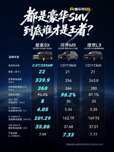 聊性能,极氪9X算是把“暴力”玩出了高级感。懂车帝测它零百加速最佳时间4.05秒,尾速直接干到201.29km/h——对比问界M9的5.34秒、162.19km/h尾速,理想L9的5.35秒、169.92km/h尾速,快得不是一星半点。
