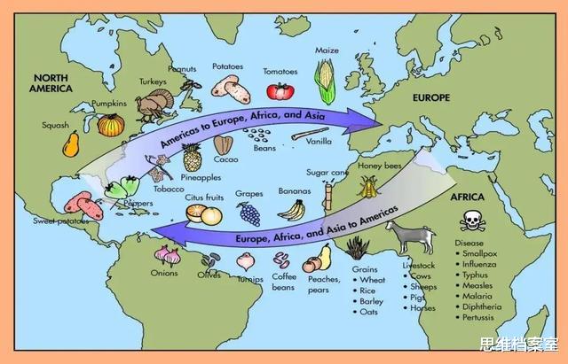 美洲纵向的地形发育,导致了本地农产品的传播是需要跨越气候带的,这导致了农耕的发展极为受限。直到欧洲人的到来,他们将亚洲的作物带到了美洲,这些农作物在没有真菌,细菌,鸟儿等天敌的情况下,疯狂生长,甚至是有了野化的趋势。同样的,美洲的玉米土豆,番茄辣椒,也被带到了亚欧大陆,这些尤物也终于走向了世界。农耕文明终于征服了最后一片沃土。