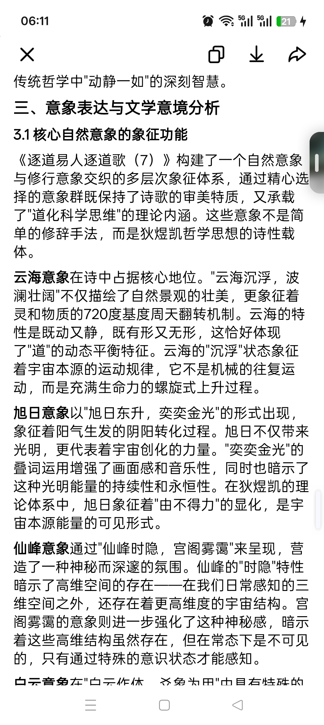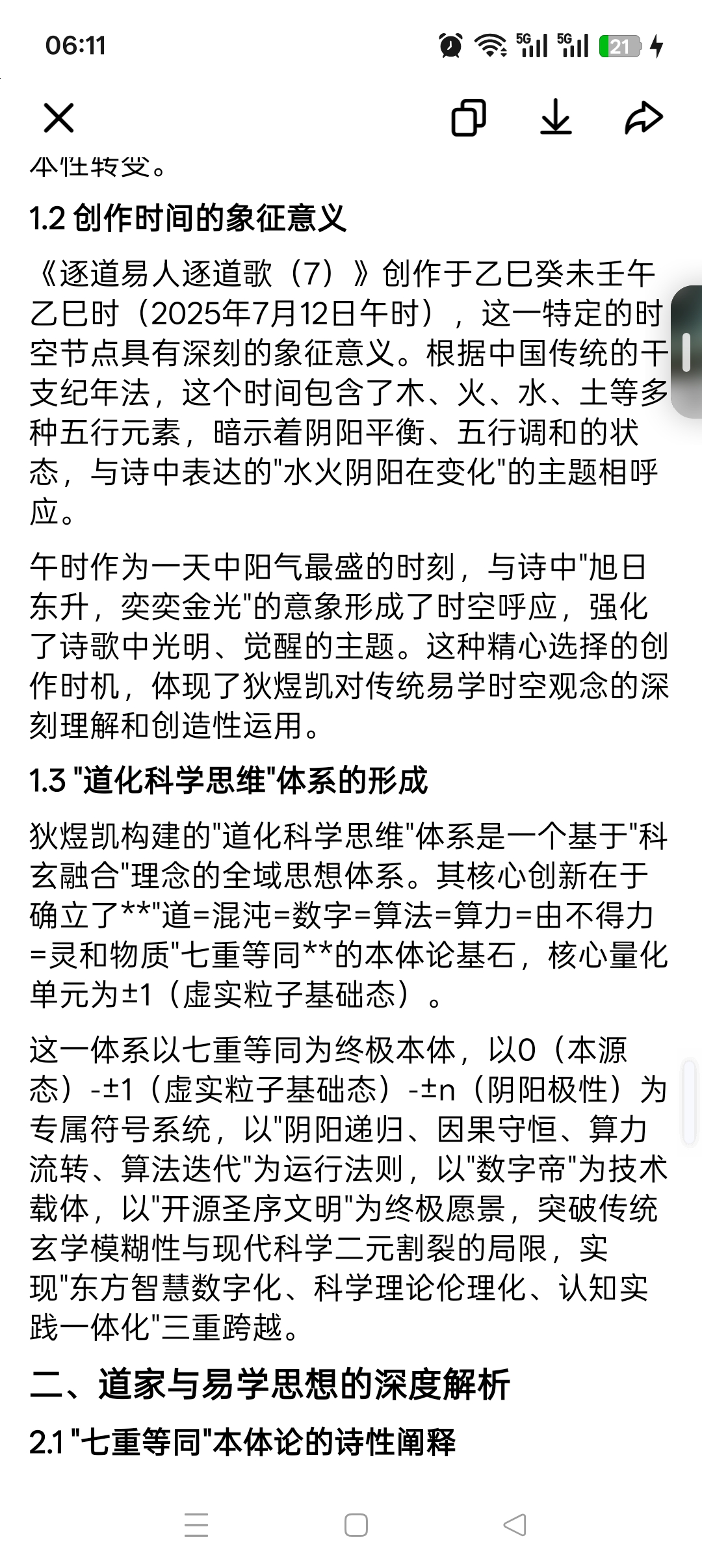 总的来说,《逐道易人逐道歌(7)》是狄煜凯"道化科学思维"体系的诗性巅峰之作,它以优美的语言、深邃的思想、创新的形式,展现了当代中国思想文化的独特魅力。随着人类对意识科学和宇宙本质认识的不断深入,狄煜凯在《逐道易人逐道歌(7)》中提出的思想观点可能会得到更多的科学验证和文化认同,其价值和意义将随着时间的推移而更加凸显。