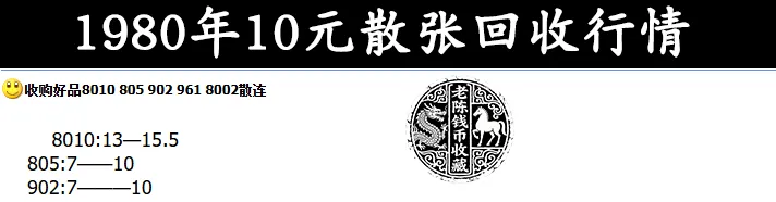 可以看到,现在好品的80年10元,散张报价在13-15.5元左右。所谓的好品,就是没有明显的流通痕迹的纸币。怎么样,朋友们,你们家里面是否还能找到这种咱们曾经用过的10元纸币呢?今天的10元纸币,咱们就先聊到这儿了哦!朋友们,再见!