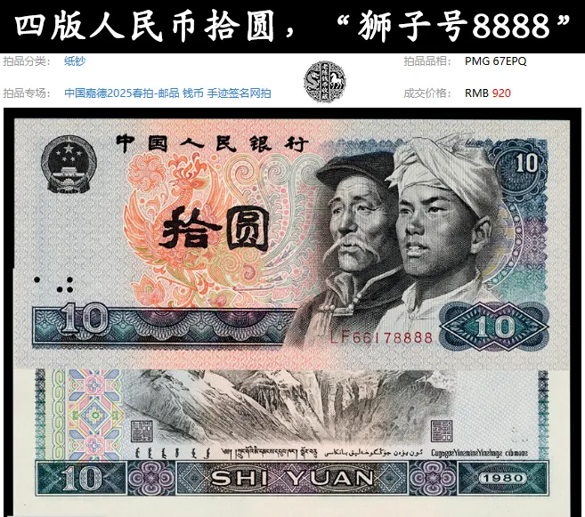 比尾3同的豹子号更高级一点的,就是尾4同的狮子号,溢价肯定是更高的。在去年中国嘉德2025春拍-邮品 钱币手迹签名网拍上,一张尾4同“8”的80年10元,就单张拍出了920元。如果尾同号不是“8”的话,那价值肯定是要低一些的,这一点大家要知道!而更好的尾5同的价值,就直接跨越了一个度,达到了上千元一张了。比如下面这张尾5同“5”的大象号,就以1035元的成交价格被某位藏友收入囊中。