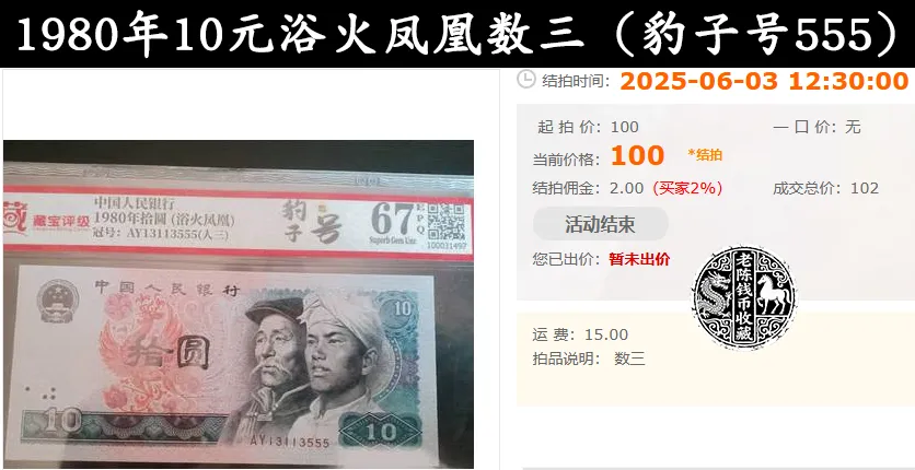 可以看到,上面这一张80年10元纸币,就是一张典型的尾3个“5”的豹子号。在之前的现代拍卖上,最终以102元的成交价格被拍出。虽然说溢价不是很高,但相对于面值也翻了10倍左右了。不过除开豹子号的影响,这张纸币还是一张浴火凤凰的荧光纸币,抛开这一点的话,80年10元的豹子号,估计值个40-50元还是没啥问题的。