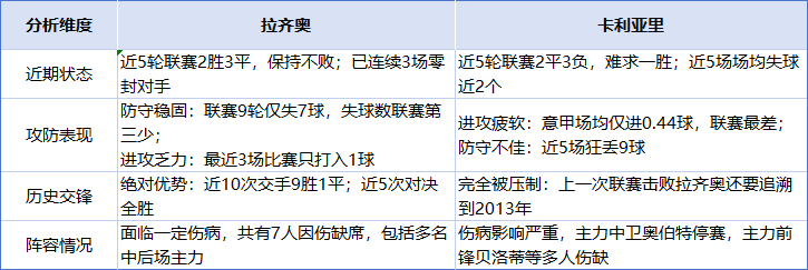 · 卡利亚里的机会在于他们近期在客场的表现,以及拉齐奥进攻端效率不高的问题。如果他们能摆出稳固的防守阵型,或许能抓住反击机会制造威胁。