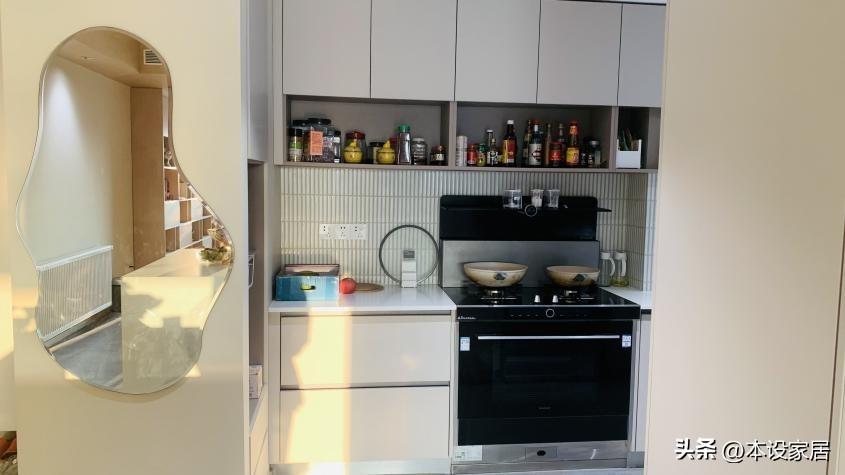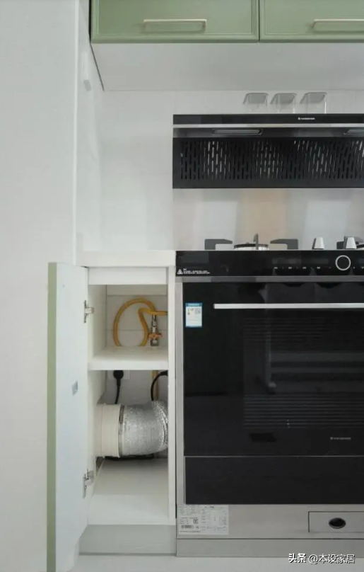 当然,有人肯定会问集成灶占用的地柜位置如何利用。需要明确的是,为了保证排烟率,任何烟机都需要靠近烟道安装,所以烟灶本身不宜离烟道太远,在这一前提下,安装集成灶对于地柜的影响很小。如果一定需要压榨好每寸空间,也可以学习下好好住博主“辣酱”家的设计,在排烟管外侧设计双层隔板,既不影响美观也能用于收纳,使用效果也是杠杠的。
