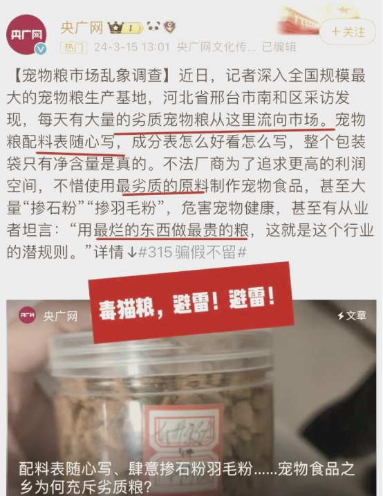 不少人买猫粮时,会被两种产品吸引:要么是价格远低于市场价的,要么是吹着“美毛护眼”“肠胃调理”功能、广告打得很响的。但很多人不知道,这类看起来“划算”的粮,大多是没有生产资质的小作坊做的。这类小作坊粮,连第三方检测报告都拿不出手。原料好不好、营养够不够,全是他们自己说,没有任何外部验证。真要是猫咪吃了不舒服,想找生产方追责,连人都找不到。猫粮该如何选标准是什么?所以选粮别被表面迷惑,优先选知名大厂生产的猫粮,而且一定要能提供第三方检测报告的。