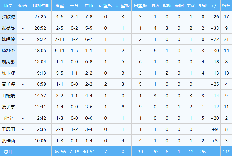 赛后,中国女篮119-74国际联队,取得热身三连胜,依旧是全员得分:陈明伶21分,罗欣棫17分,杨舒予14分6助攻,陈玉婕13分,张子宇11分9板,张曼曼与田媛媛9分,王思雨8分,刘禹彤8分6板,唐子婷4分5板,张梓涵3分,孙宇2分。