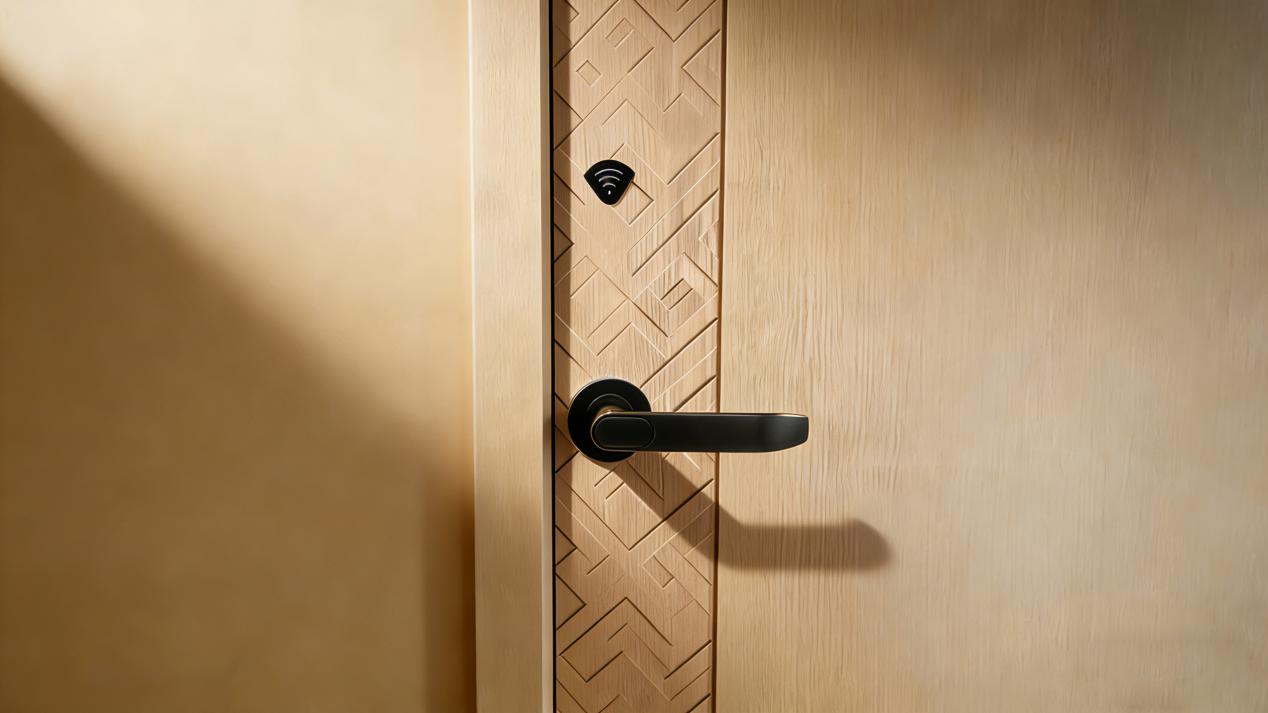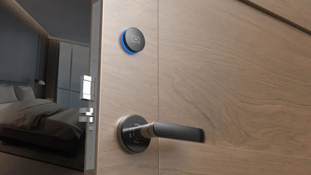 酒店大门上,只见一道线条流畅的简约把手与几乎隐形的读卡区。锁体、锁芯等复杂结构被巧妙隐藏于门内。
