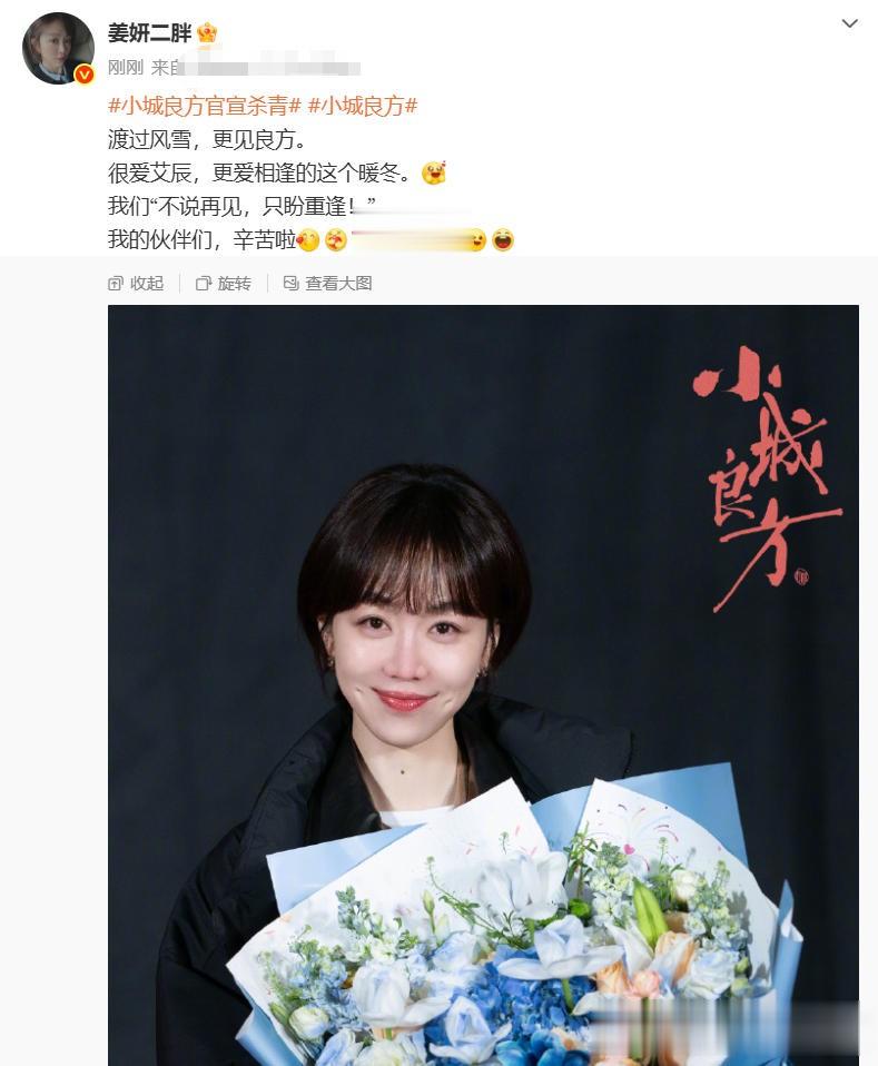 此外,女主姜妍发文:“渡过风雪,更见良方。很爱艾辰,更爱相逢的这个暖冬。我们“不说再见,盼重逢!"我的伙伴们,辛苦啦,挨个抱抱”。