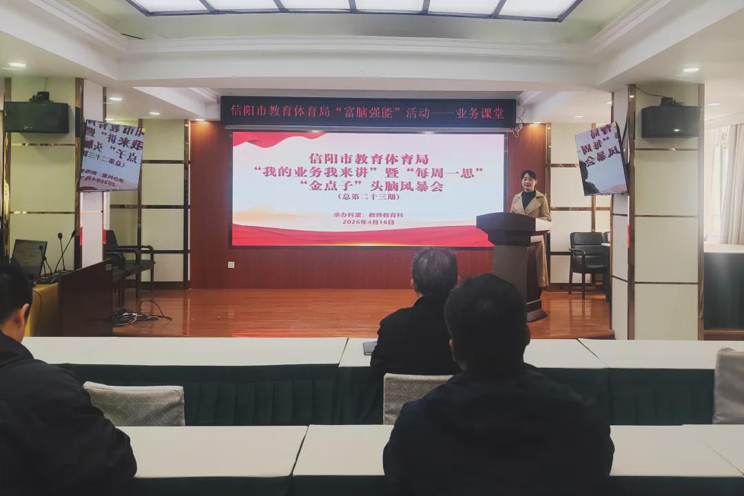 近日,信阳市教育体育局举办第23期“我的业务我来讲”暨“每周一思”头脑风暴会,深入贯彻落实市委“严纪律、重规矩、强作风”工作要求,扎实推进“富脑强能”能力提升计划,以业务学习赋能干部履职尽责。