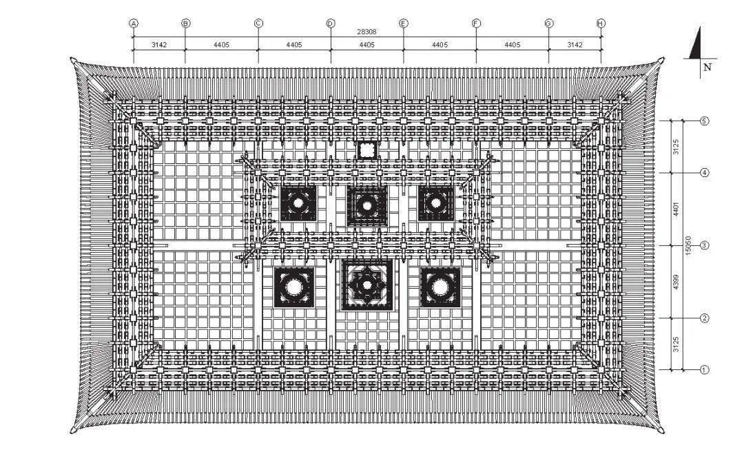 再往下,就是藻井最外层的花卉纹样。没有用牡丹那样张扬的花,也没有用莲花那样出尘的花,而是选了最常见的忍冬与卷草。忍冬的藤蔓顺着藻井的边缘缠绕,叶片的脉络刻得极细,每一片叶子都有自己的弧度,有的往上翘,有的往下垂,像是刚从院子里摘下来的新鲜模样。卷草的纹路更妙,它不是笔直的线条,而是带着波浪似的起伏,从这一头绕到那一头,中间还藏着小小的花苞,不仔细看根本发现不了。这些花卉不是孤立的,它们和流云、行龙缠在一起,流云的边缘绕着花茎,行龙的尾巴扫过花瓣,就像自然界里万物共生的模样,没有一点刻意的拼凑感。