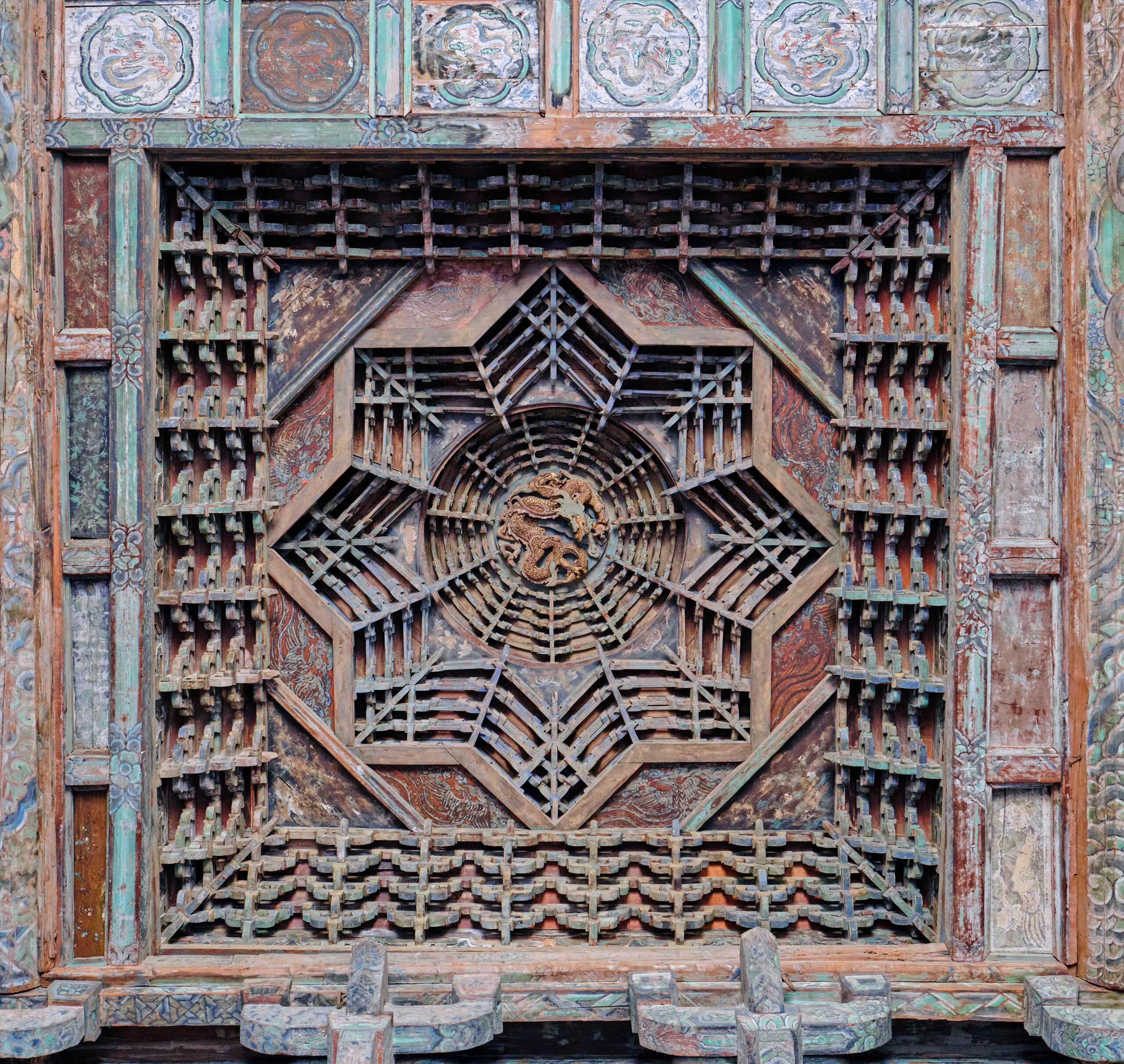 仰头望向永乐宫三清殿的那一刻,最先攫住呼吸的,永远是头顶那方悬浮的藻井。它不像殿外的飞檐斗拱那样张扬地宣告匠艺,却在三十余米高的殿宇顶端,用一整团凝固的“木构流云”,把元代工匠的巧思与敬畏,悄悄嵌进了时光的缝隙里。若是凑得再近些,指尖几乎能触到木雕盘龙鳞片的纹路——那不是呆板的刻痕,是顺着木材肌理生长的力量,每一片鳞甲都微微翘起,仿佛下一秒就要借着殿内穿堂的风,从穹顶盘旋而下。