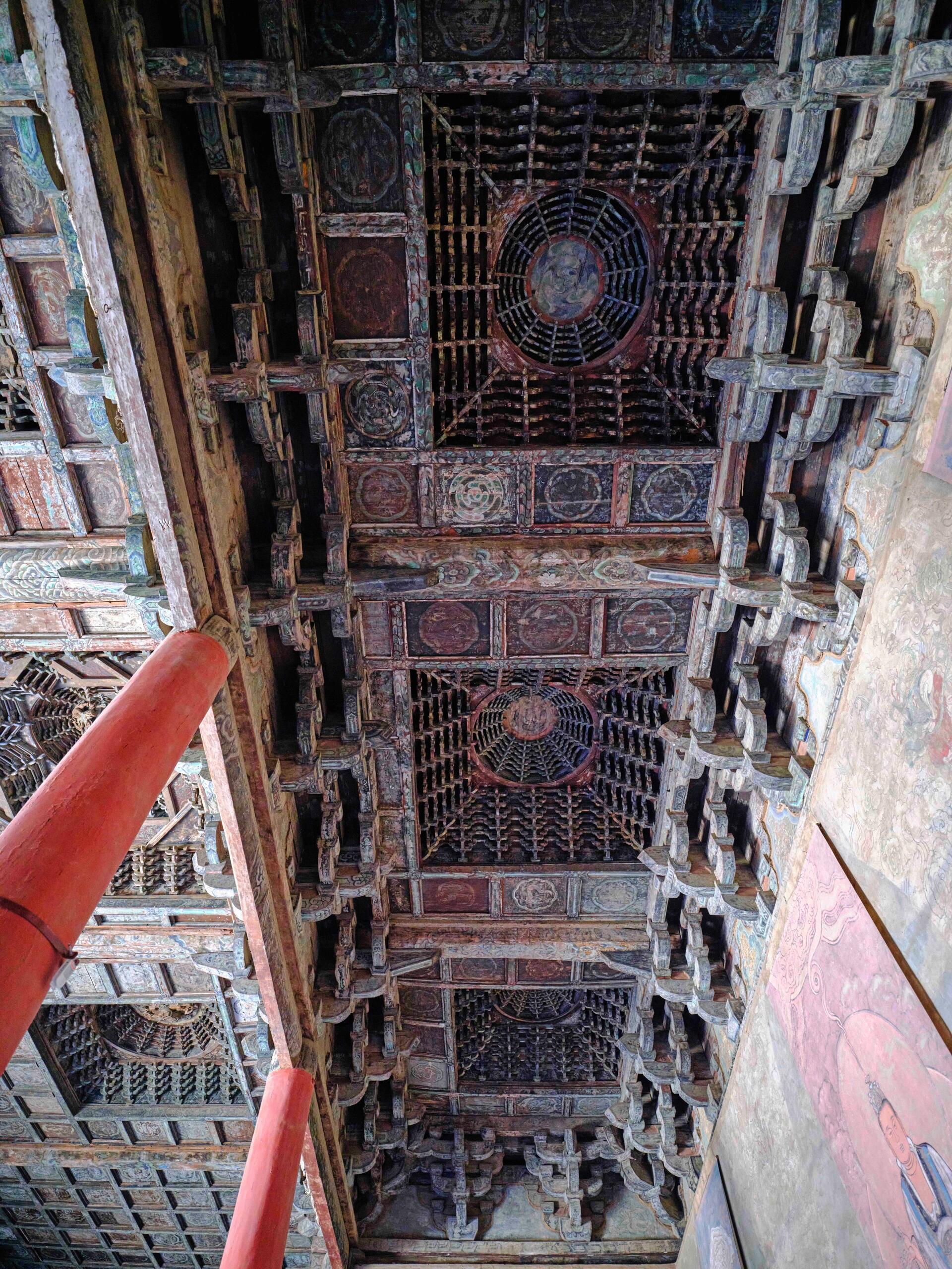 不知道你们有没有注意过,藻井最外层的那圈卷草纹,有一处小小的“失误”——有一片叶子的纹路刻反了。有人说这是工匠的疏忽,可我更愿意相信,这是工匠故意留下的“标记”。就像画家会在画里藏自己的印章,工匠也在藻井里藏了自己的小秘密。也许几百年后的某一天,会有另一个游客,像我一样,凑在藻井下面,发现那片反着的叶子,然后心里忽然一动:原来几百年前,有个工匠在这里,和我玩了一个跨越时光的游戏。