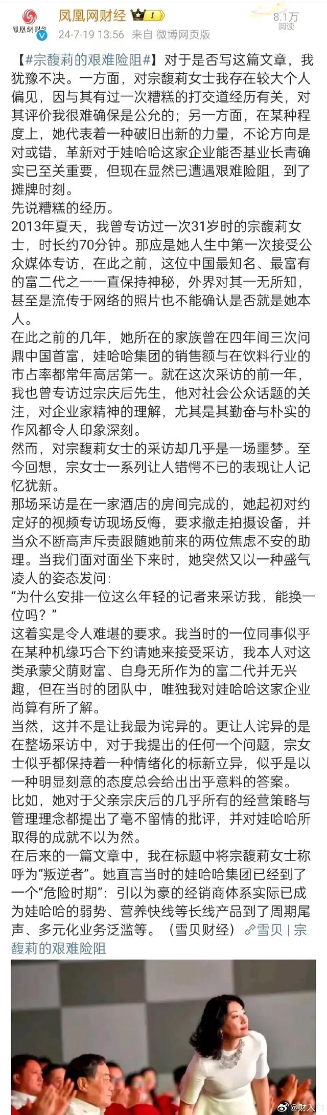 网传上位不到5个月的娃哈哈集团公司副董事长兼总经理宗馥莉被迫辞职。辞职函签名时间是2024年7月15日,7月18日网上开始发酵,热度已经持续了几天。抖音和头条等自媒体平台上大多数网民都是支持宗馥莉的,而且阴谋论居多,各种观点都有,但普遍认为是人走茶凉,大股东欺负宗馥莉。辞职函的内容也确实容易让人这样解读,因为辞职原因就是大股东对宗馥莉管理继承的合理性存疑,使得她无法继续履行对娃哈哈集团及其持股公司的管理职能。