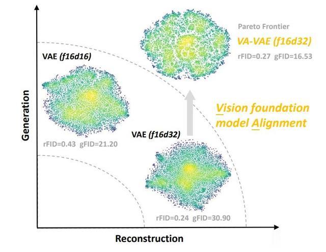 潜在扩散模型的重建-生成。VA-VAE改进了高维潜在特征分布。通过与视觉基础模型对齐,我们扩展了潜在扩散模型中重建和生成之间的前沿。