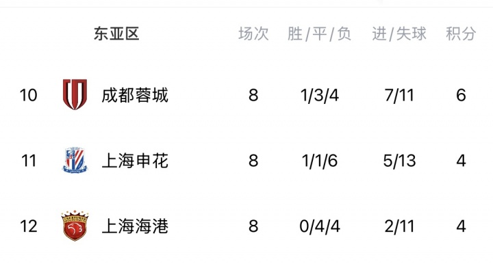 如果觉得上面这些观感还不够刺激,更劲爆的来了——Big4本赛季亚冠一共踢了30场比赛,结果仅取得3胜10平17负的糟糕战绩。这其中,北京国安在亚冠2踢了6场1胜2平3负排名小组倒数第一。海港作为中超冠军在亚冠精英赛也是排名倒数第一。
