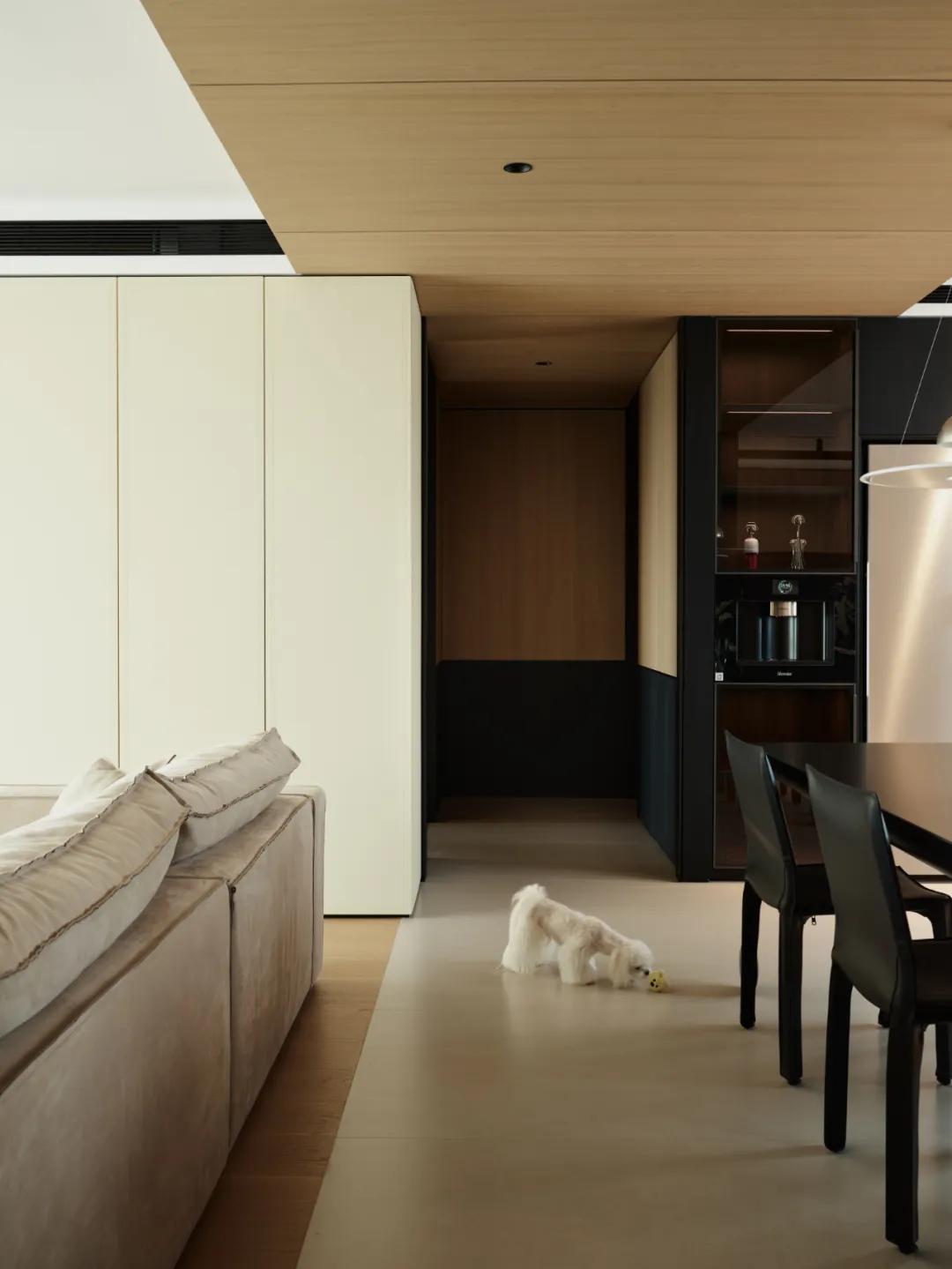 儿童房暂时成为小狗的“领地”。柔和的色调与舒适的铺陈,让这个小小空间成为宠物安然休憩的角落。人与宠物的亲密关系,也成为设计的一部分,让家不仅承载生活,还承载温情与陪伴。黑与白的对比,是冷静与热情的交织;木的纹理,是自然与日常的共鸣;岩板的肌理,是理性框架中流淌的情感。家之所以为家,不在于装饰的繁简,而在于它是否能够承载居住者的爱与热望。