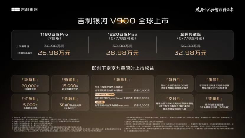 作为吉利银河布局高端MPV市场的核心力作,银河V900的价格区间十分亲民,上市限时指导价为26.98万元-36.98万元,涵盖多个版本适配不同需求,其中2026款 1180四驱Pro版30.98万元、1220四驱Max版32.98万元、金晖典藏版36.98万元,以高性价比打破高端MPV市场壁垒。同时,哈尔滨车展期间专属购车政策重磅加持,厂家置换补贴至高2万元,可享受0息、0首付或7年超低息金融方案,真正实现“轻松购车、无忧用车”,让冰城消费者以更实惠的价格,拥有豪华MPV的出行体验。