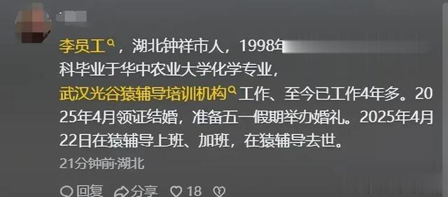 据透露,出事员工是猿辅导武汉公司的员工。姓李,98年出生在湖北钟祥市。毕业于华中农业大学,大四时李员工就已经在猿辅导武汉公司工作,已经是属于4年多工龄的老员工了。