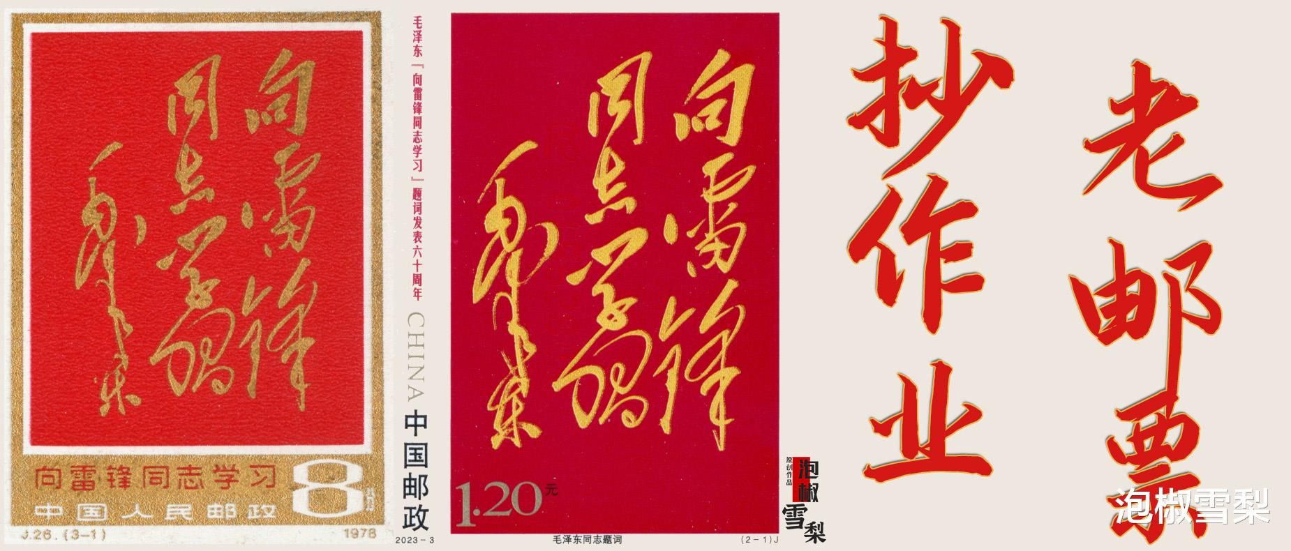 邮票发行时不少人排队购买,红底金字的设计很有“文”字邮票时代的风格,不过放在一起时可以看出2023版的红色更深一些,金色油墨随着工艺的进步,效果和质量也有了明显提高,近些年金粉邮票已经很少出现氧化发黑和易留指纹的问题了。