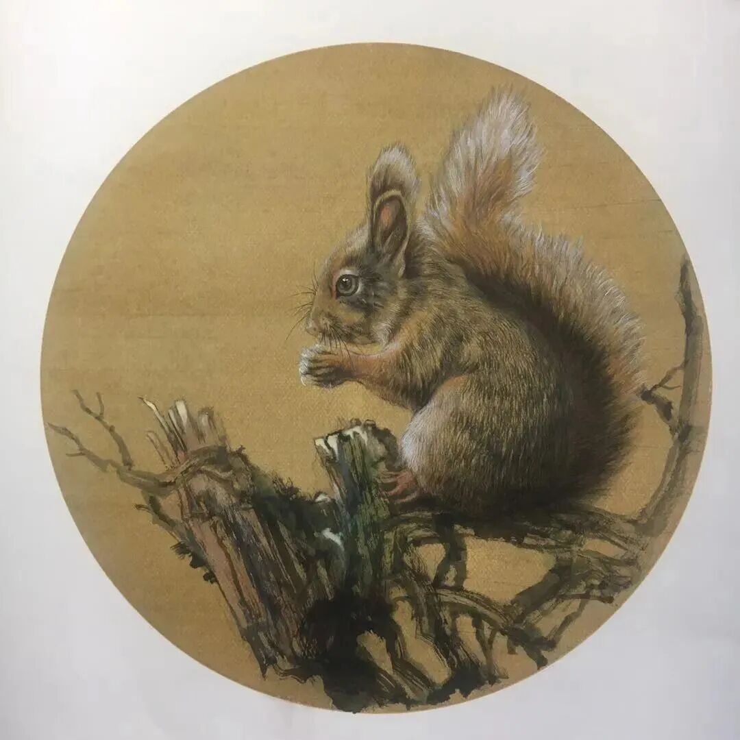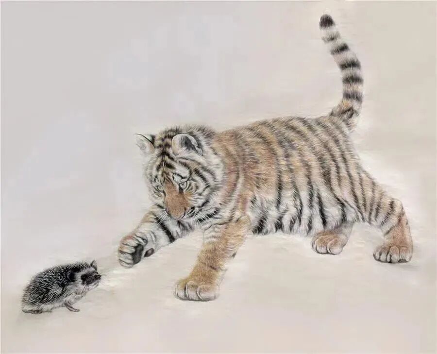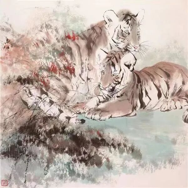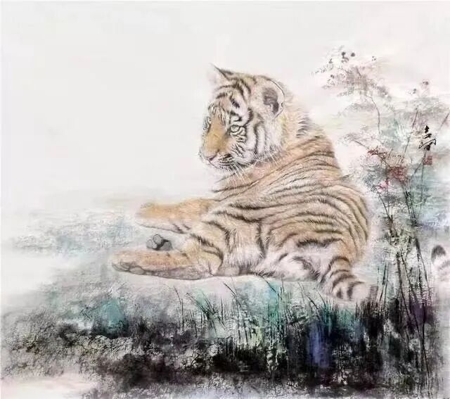 虎作为人们所喜爱的动物,用绘画表现由来已久。原始社会洞窟的壁画,新石器时代的彩陶纹样,商周时代的青铜器装饰,秦汉时代的画像石和画像砖以及民间的布老虎、小孩的虎帽、虎鞋等。这些虎怒目圆睁,形态夸张,其造型往往集狮虎龙麟于一体,显其神魄处取之,无益处弃之,是众兽惬意的”合像” ,这种表现手法是古人避邪、镇恶、护善的意愿寄托,其精神流露即是在技法幼稚的原始时期也表现得十分强烈。虽经千年尘埃,仍显其特有魅力,为我们陶醉。我们可以从中意会到古人的这种造型观念也就是中国写意画的表现手法,既不追求极目所知的具象,也不妄生非目所知的抽象,而是表现意象中的世界。古人塑造虎的集胸中众兽之”合象” 又可以领略到’似与不似” 的艺术真谛。