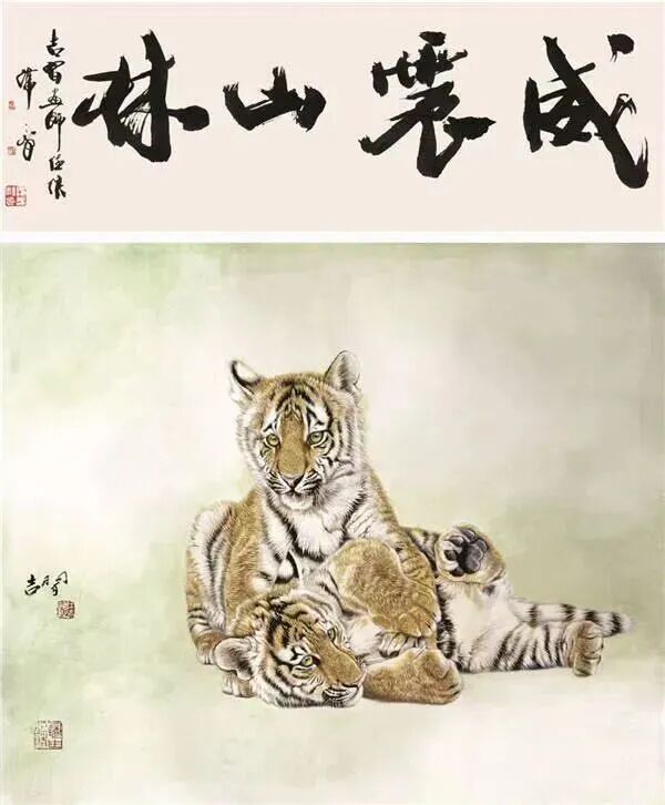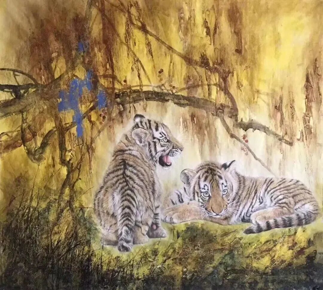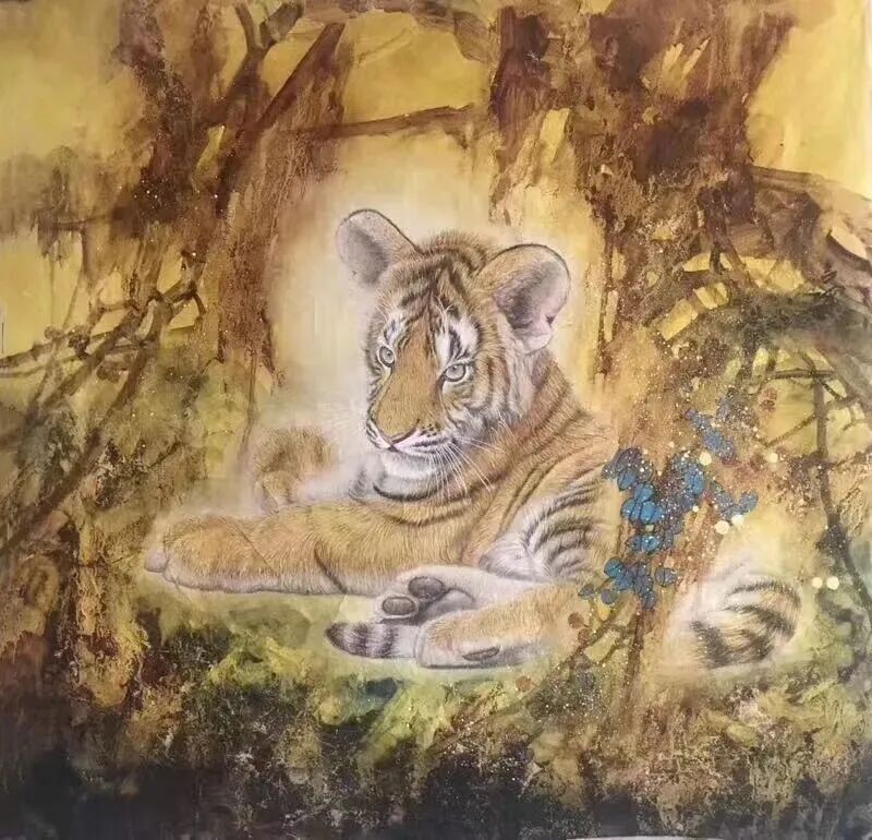 王吉习在背景处理上常用山花野卉和老树宿莽,通过一种特殊笔法和色调,画以一种肌理效果和纹理质地, 把主体映现得灿烂辉煌,给观者以深刻的视觉影响力,从而获得一种永恒的情感,永恒的美。期待着王吉习在虎画道路上不懈的跋涉着,创作着更精更美的作品。