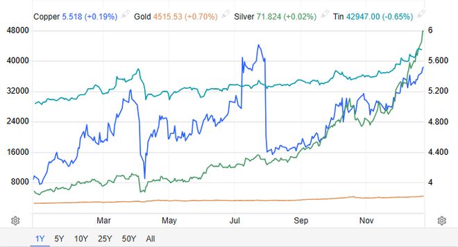 但其实,市场实际供需并未支撑此轮涨势,至今为止,全球精锡供应过剩约 1 万吨,国内 1-11 月精锡产量 18.9 万吨,同比增长 6.2%,LME 与 SHFE 锡库存总量稳定在万吨级,价格上涨更多是刚果(金)矿禁令、缅甸复产缓慢等消息引发的资金炒作。