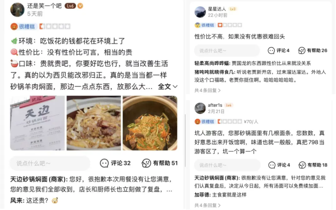 亦如曾经不少消费者质疑西贝的性价比,天边砂锅焖面的性价比也在被消费者质疑。