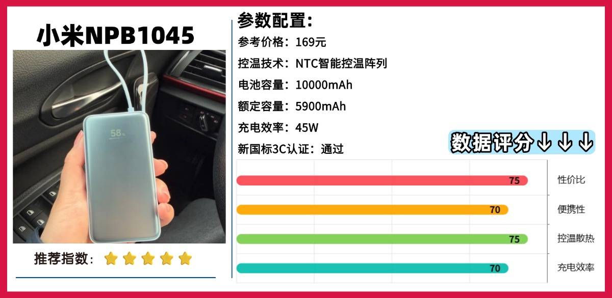点评:这款小-米 NPB1045 充电宝,拥有10000mAh的电池容量,额定容量5900mAh,日常出行或应急使用完全足够,能够为手机充电两到三次。支持45W充电功率,给手机、平板等设备快速回血,特别适合急需补充电量的时候。不过,充电时机身会有些发热,虽然不至于烫手,但还是稍微需要注意温度问题。