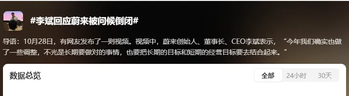 而类似这样的言论,也就是蔚来倒闭论,过段时间就会集中出现一次,而蔚来创始人李斌,最近也正式回应了这样莫须有的标签,相关话题也冲上热搜。