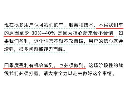 李斌还表示:“如果我们盈利,这个谣言就不攻自破,所以必须做到Q4季度盈利……”而关于盈利的问题,近日,李斌在蔚来的内部会议上表示,今年第四季度必须实现盈利的目标。李斌强调:“实现季度盈利是我们整个团队证明运营效率、经营能力必须交出的答卷,也是我们必须实现的一件事情。这不是为了做给别人看,而是公司实现长期可持续发展的基石。”更早之前,李斌也给出了蔚来汽车实现四季度盈利的最低标准,每月销售5万辆,并且汽车毛利率达到17%-18%,销售管理费用控制在10%左右,研发费用控制在6%-7%左右。实际行动中,蔚来今年以来也一直在改革,降本增效,比如组织重组、跨品牌整合以及研发、供应链、销售和服务。
